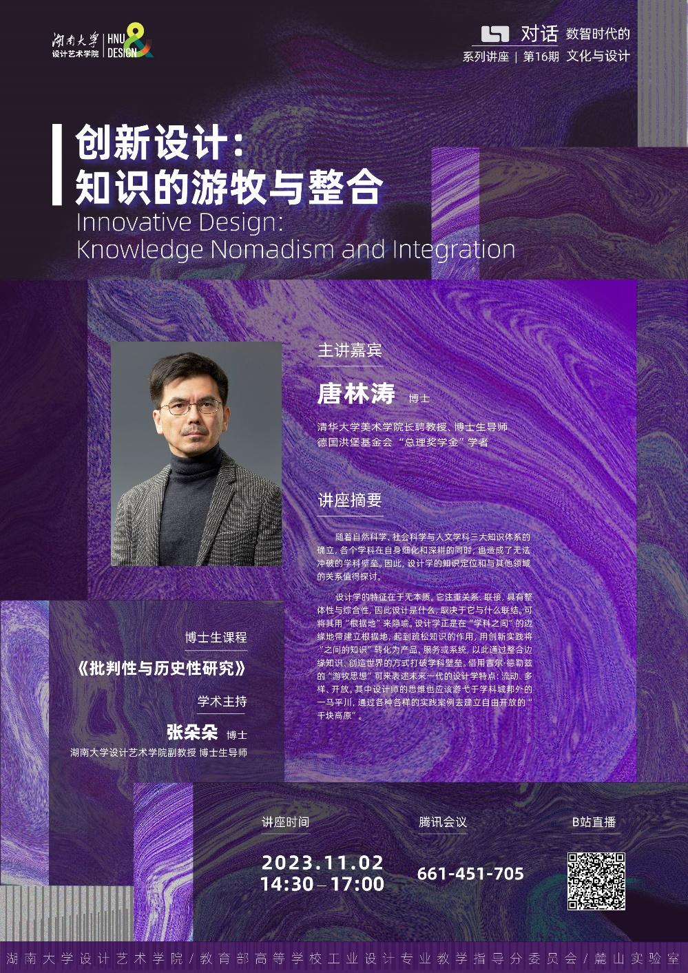本次讲座特邀清华美院的唐林涛教授,以“创新知识:知识的游牧与整合”为主题展开研讨活动,欢迎各位学界、业界同仁和同学参与。