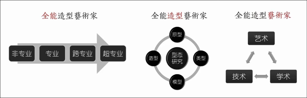 李老师从“人”“人才”“人才培养”等方面介绍如何用新的方法、新的工具、新的途径来提升人才的素养,并且引入了包豪斯的“全能造型艺术家”的人才策略。未来的设计师应具备三术合一(艺术、技术与学术)融会贯通的能力,从非专业到专业,再到跨专业,最后达到超专业的层面。