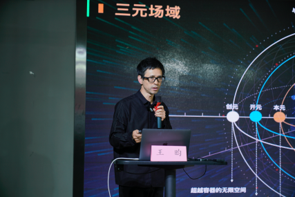 王昀的报告主题是《奇肱之境·数实共生》,他以《山海经》中“奇肱之境”的起源与当代科技的飞速发展相呼应,并结合三元场域的理念,进一步对科技与设计的关系进行探索与反思。同时,他通过虚空造物法杖、风语者等案例介绍,指出了设计、科技与文化在数实共生方面的探索可能。