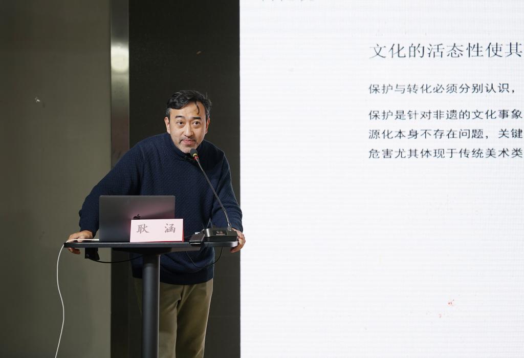 耿涵以《非遗创新利用中的三个问题:价值观、遗产观与转化观》为题,从国际与中国在价值观、遗产观上的不同认识出发,阐述了非遗创新当中的转化观,强调了文化的活态性特点以及三大危害。他主张设计师与传承人之间的关系思考,并从主体身份、传承帮助、格局构建三个方面指出了设计师的可为之处。
