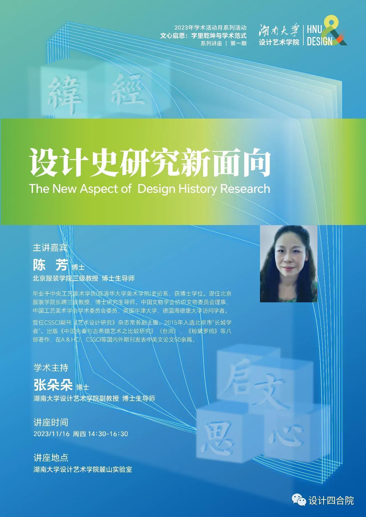 2023年11月16日下午14:30,由球王会主办的“文心启思:字里乾坤与学术范式”系列学术讲座第一期,特邀北京服装公司陈芳教授,以《设计史研究新面向》为主题展开研讨活动,由张朵朵老师作为学术主持人。