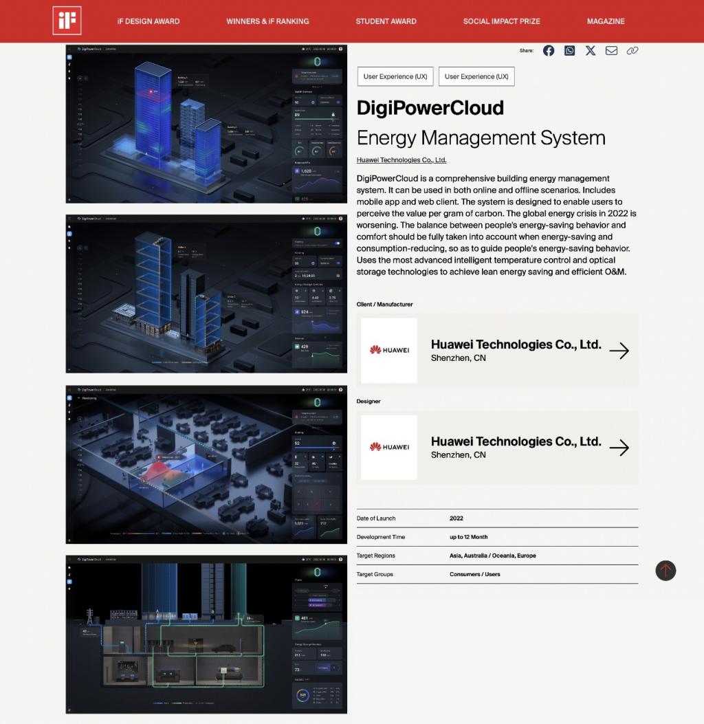 合作项目基于对建筑能源管理系统运行原理、节能技术、人员舒适度以及现有体验度量标准与模型的研究,梳理了用能行为典型任务和各类行为触点,建立了适用于建筑能源管理人员侧和用能人员侧的体验度量体系和方法,研究成果助力华为智慧低碳园区解决方案(Huawei Net Zero Carbon Intelligent Campus Solution)的设计优化,相应设计方案获得2023 iF Design Award (https://ifdesign.com/en/winner-ranking/project/digipowercloud/575797)。
