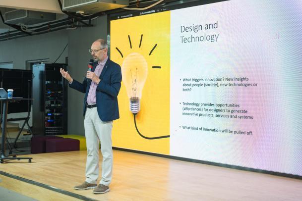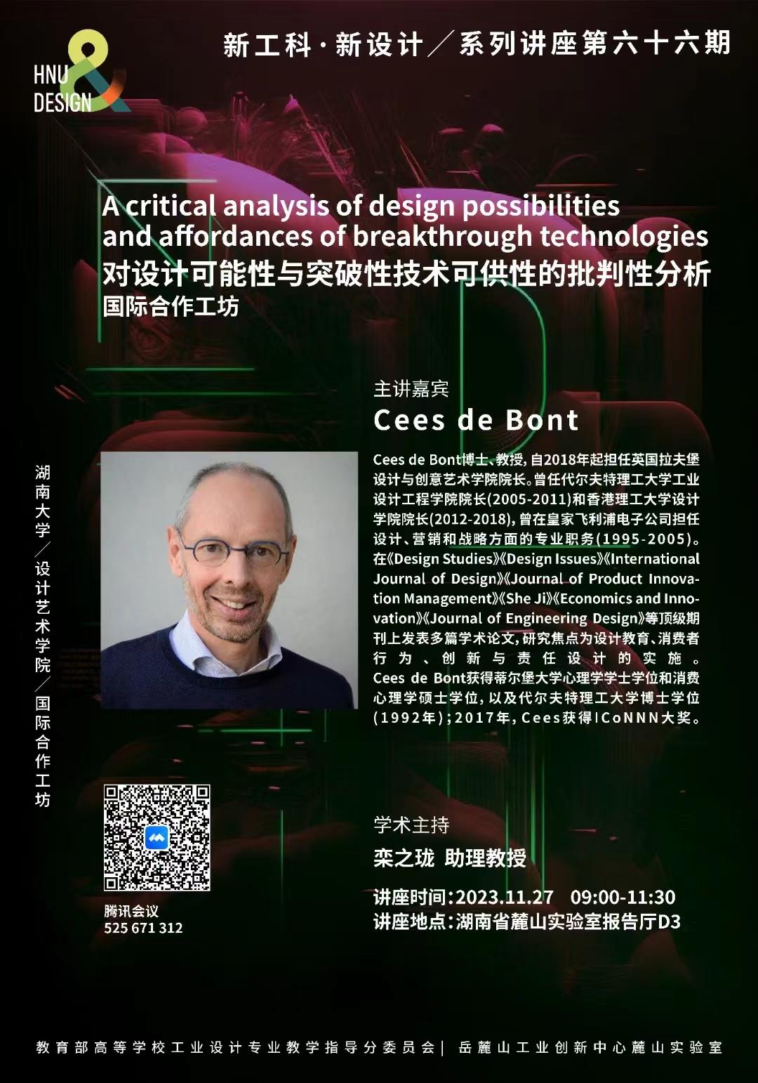 2023年11月27日,球王会、湖南省麓山实验室很荣幸地邀请到了英国拉夫堡设计与创意艺术公司经理Cees de Bont教授作为主讲嘉宾展开了新一期研究生《国际合作工坊》课程。上午部分为研讨工作坊,主题为A critical analysis of design possibilities and affordances of breakthrough technologies(对设计可能性与突破性技术可供性的批判性分析),全体同学分为12组进行了快速研讨并产出了设计分析;下午学术分享主题为An autobiographical introduction to design(设计的自传式介绍)。全天的学术活动在岳麓山工业创新中心麓山实验室开展。