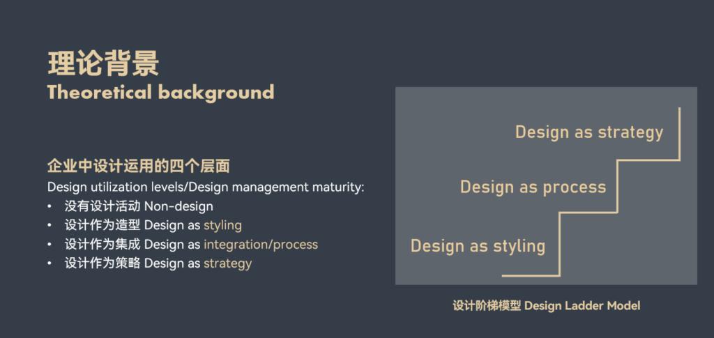 除了设计类的研究者和设计师,企业当中也应当充分重视设计的价值路径。Cees de Bont教授借鉴设计阶梯模型,将企业运用设计的深度归纳为四个层次,分别为:没有设计活动、设计作为造型、设计作为集成、设计作为策略,其中又以Design as Strategy设计作为策略最为重要。