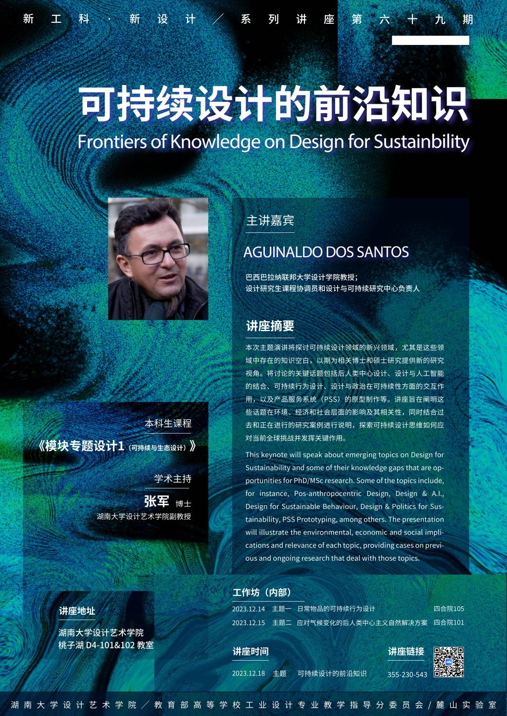 由科技部高端外国专家项目和麓山实验室资助,球王会特邀巴西巴拉纳联邦大学设计学教授Aguinaldo dos Santos,以《可持续设计的前沿知识》为主题展开工作坊、讲座等研讨活动。欢迎学界、业界同仁及同学们参与。